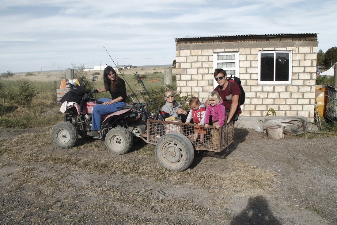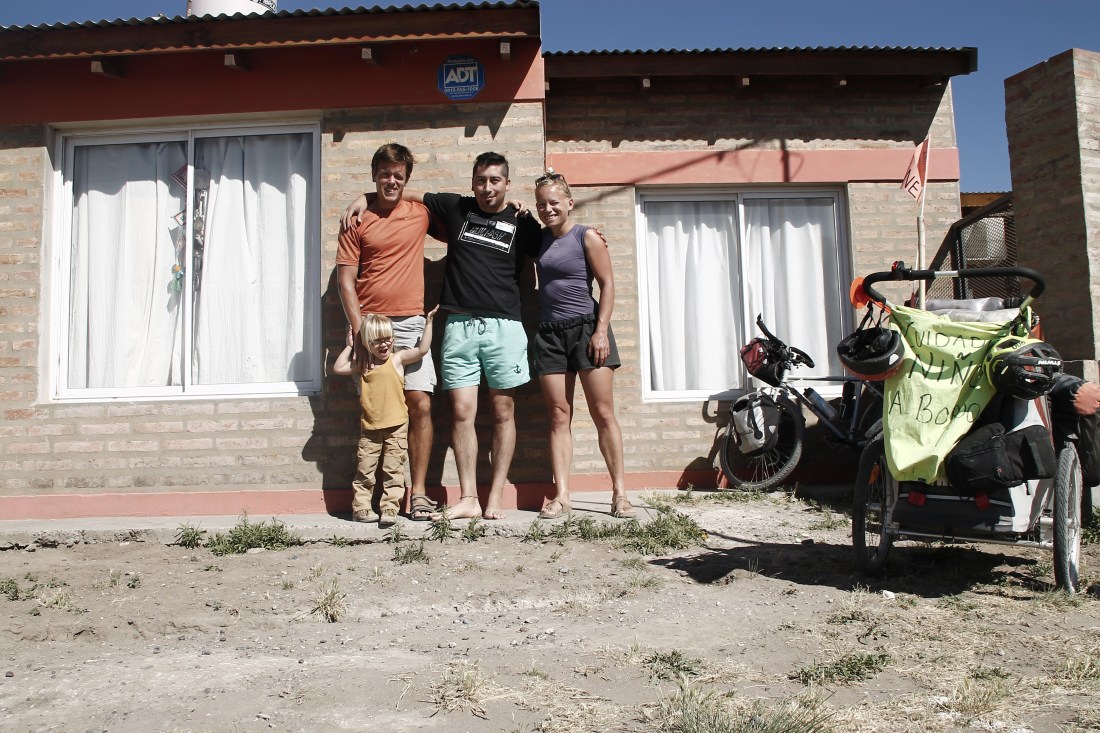 Arrivés avec le vent de face, nous repartons avec le vent de face dans le sens opposé. L’objectif pour Noël est Trelew, capitale du Chubut, la région galloise de l’Argentine. Au pied du titanosaure grandeur nature à l’entrée de la ville, nous faisons la connaissance d’Adrian Hughes, Gallo-mapuche et vendeur de stickers de dinosaure. Un drôle de zig de premier abord qui, après 5 minutes nous propose de nous prêter la maison de ses voisins partis en vacances et après 10 minutes nous invite chez lui et sa famille pour le réveillon. Séjour plein de surprises donc, dans cette ville qu’on nous avait vendu comme affreuse. Nous passons 2 jours avec les Hugues, des gens formidables avec qui nous nous lions d’amitié et que, de surprise en surprise, nous ne serons pas sans revoir. Le prochain objectif est la traversée de la route 25 qui relie l’Atlantique à la Cordillière en 500 km.